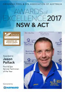 Jim’s Pool Care continues its winning streak this year, as Jason Pollack from Jim’s Pool Care Umina takes out two prestigious awards at the recent 2017 NSW SPASA Awards.